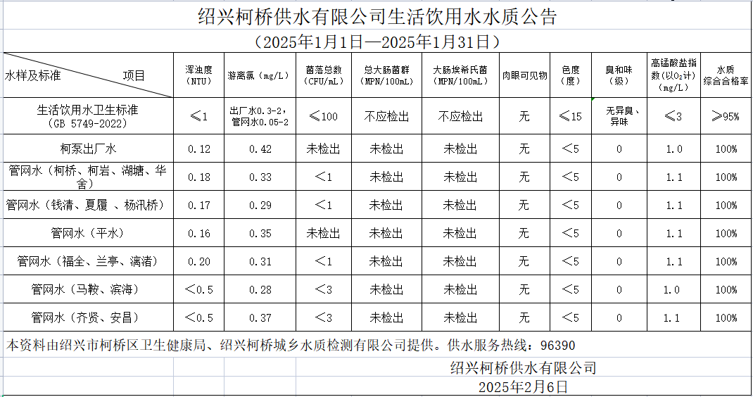 紹興柯橋供水有限公司生活飲用水水質公告(2025年1月1日—2025年1月31日)