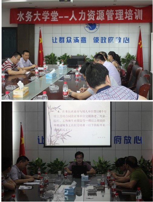 7月19日,縣水務集團第七期水務大學堂在濱海水司辦公樓三樓會議室順利舉行,縣人力資源與社會保障管理局賀東權主任和呂芳科長應邀授課。集團系統各個辦公室主任、分管副主任及人事管理干部共13人參加了培訓。